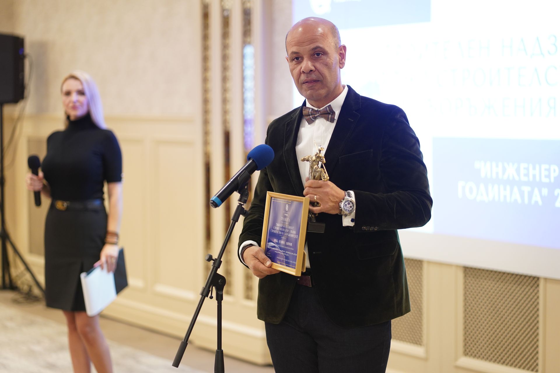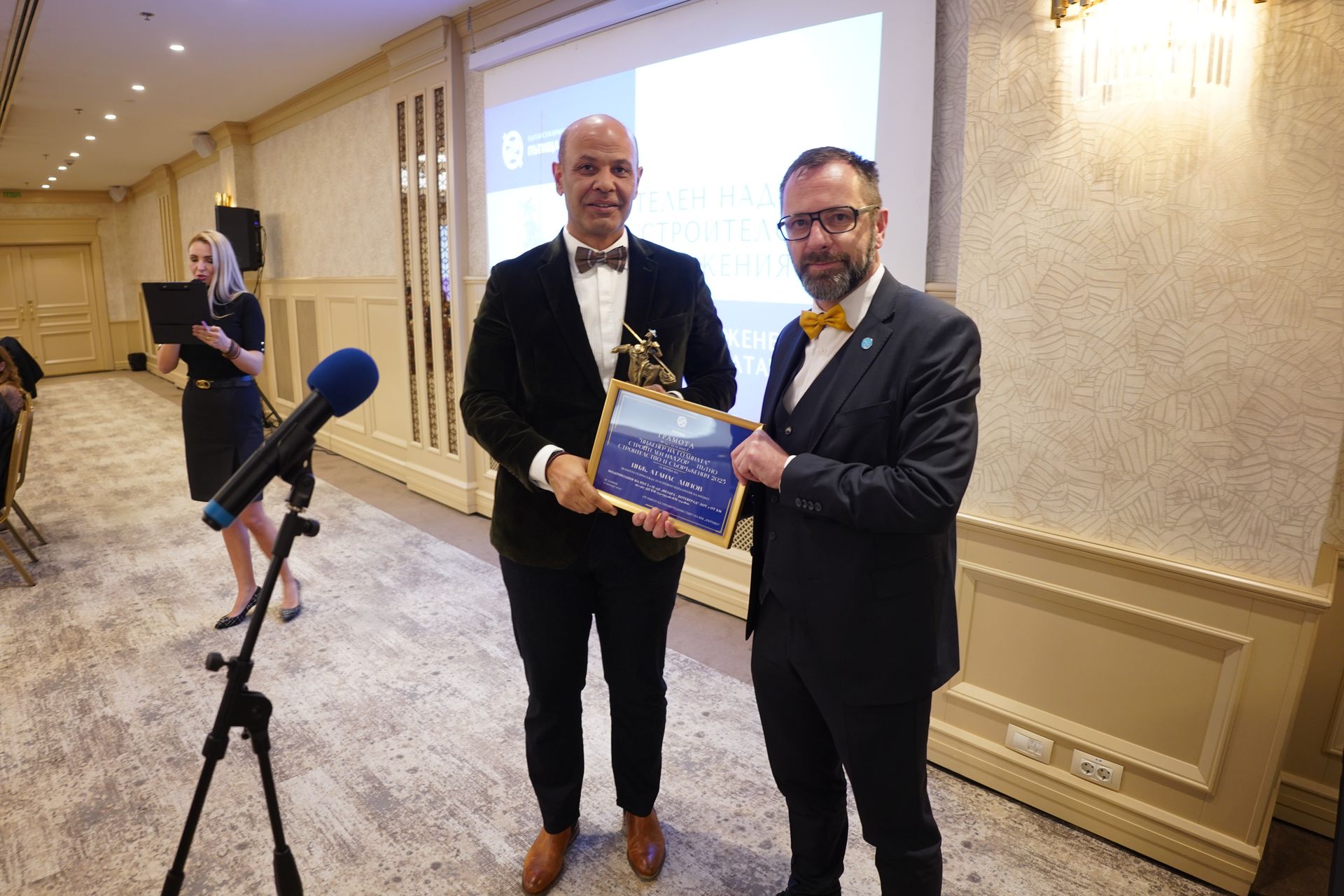 Отличието в категория „Строителен надзор – пътно строителство и съоръжения“ получи инж. Атанас Димов, връчена от инж. Йордан Вълчев, председател на Управителния съвет на Агенция „Пътна инфраструктура“.