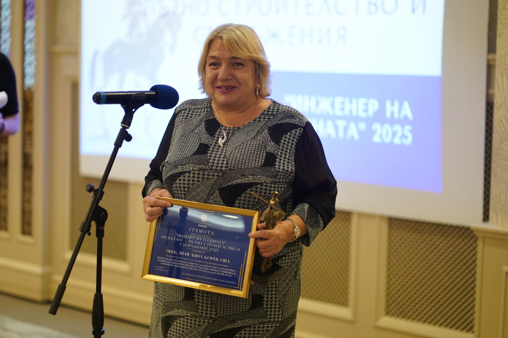 Наградата в категория „Проектант – пътно строителство и съоръжения“ отиде при инж. Венелина Борисова. Тя бе връчена от заместник-министъра на регионалното развитие и благоустройството Веселина Терзийска за успешно изпълнение на проект: